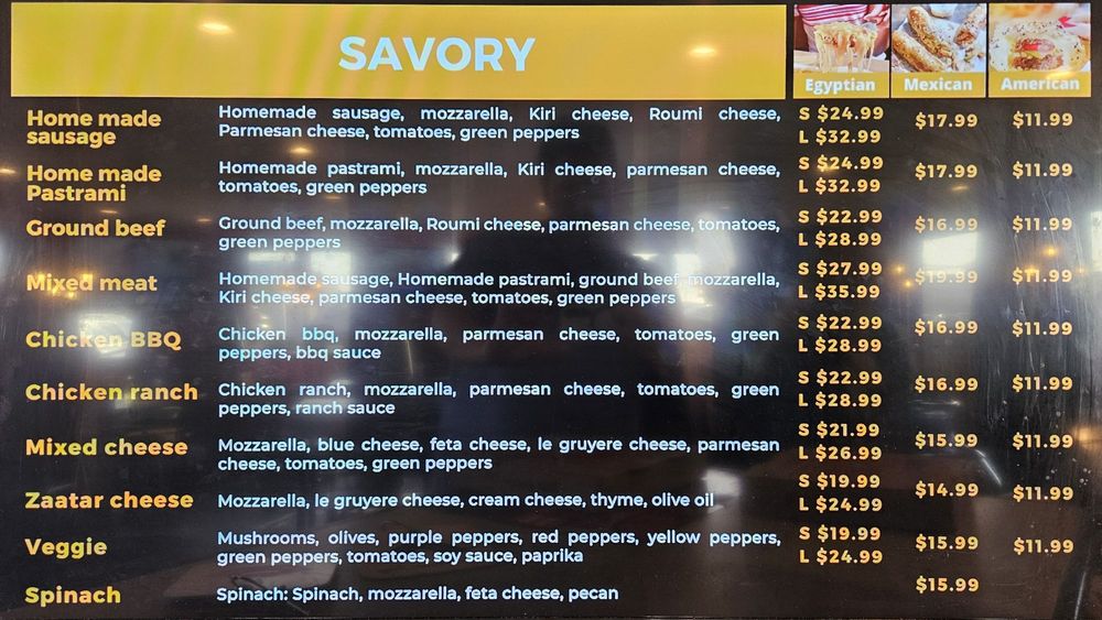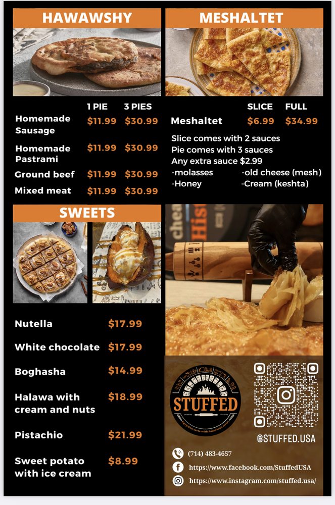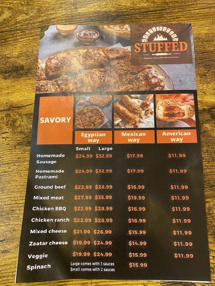 Introducing the Stuffed Egyptian Pie, a unique fusion experience offering savory delights in three delicious styles - Egyptian, Mexican, and American. Each pie is packed with flavorful fillings like homemade sausage, ground beef, mixed cheeses, and more. Customers rave about the bold flavors and generous portions of the pies, perfect for sharing with friends or enjoying solo. The tangy tomatoey and garlicky dipping sauces add an extra kick to each bite. While some reviewers mention the pricing and portion sizes, the overall consensus is that the Stuffed Egyptian Pie is a must-try for those looking to explore new culinary adventures. With options for vegetarians and meat lovers alike, this pie promises a satisfying dining experience that will leave you craving more.